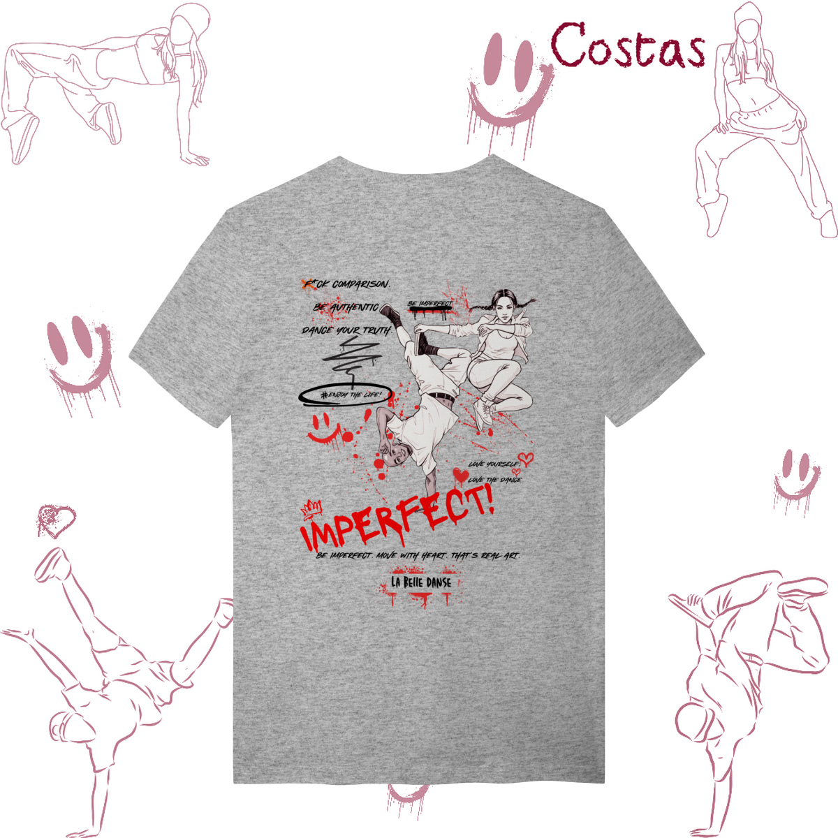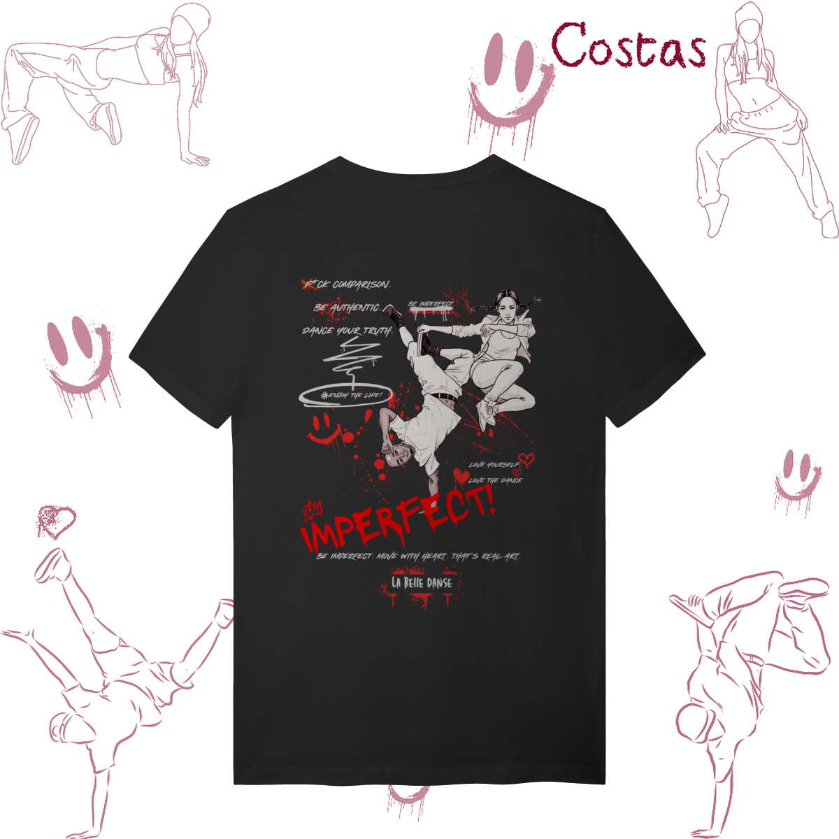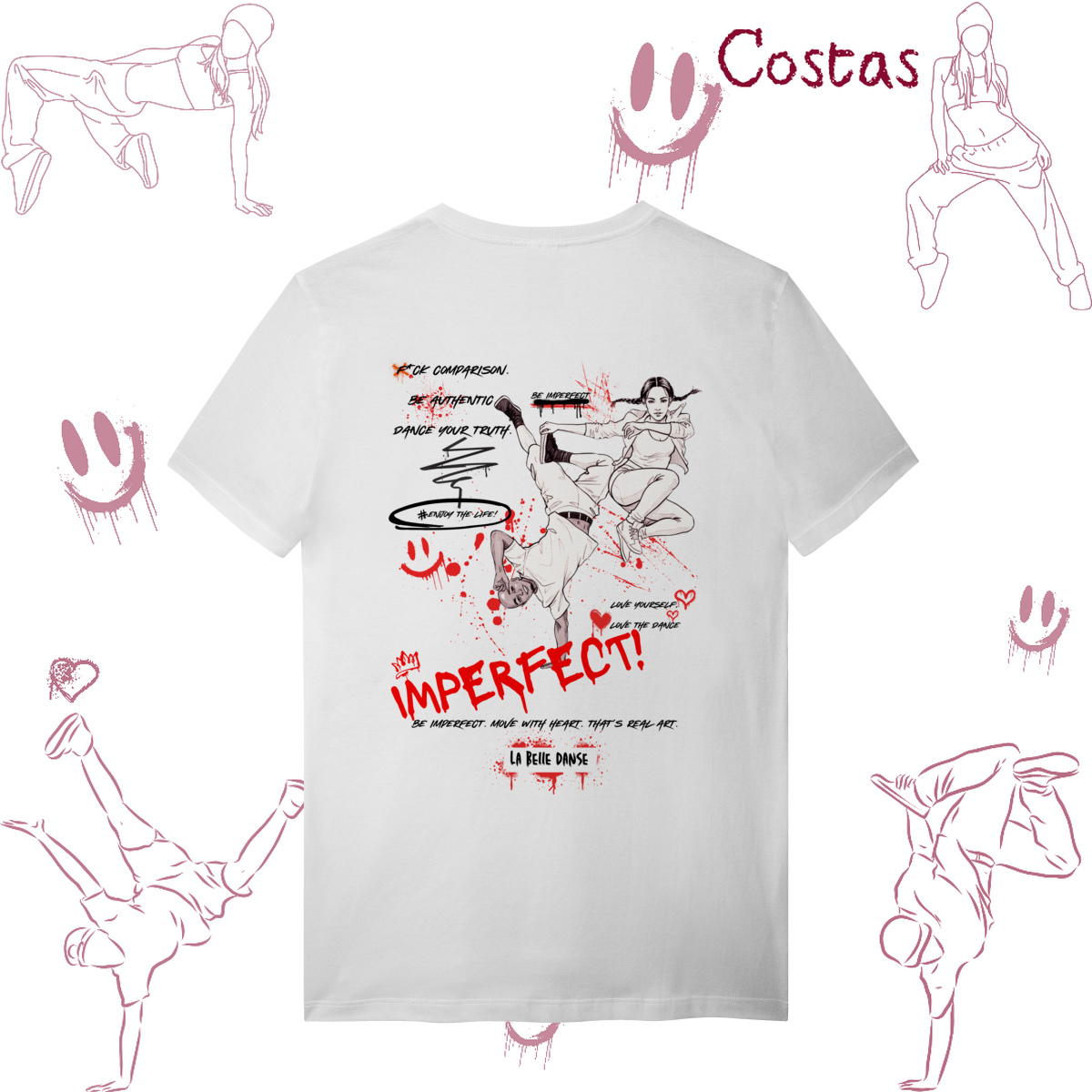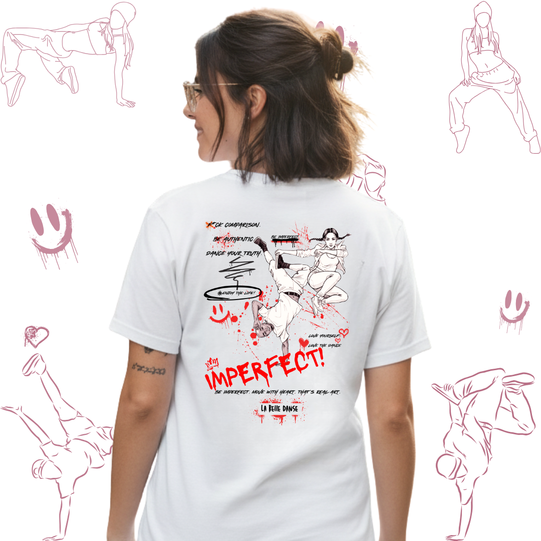 Explosão de atitude e autenticidade! A estampa Imperfect celebra o poder do hip hop como expressão real e livre. Traços intensos, vermelho vibrante e movimento em cena mostram que ser imperfeito é ser arte.
